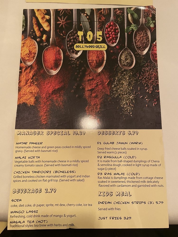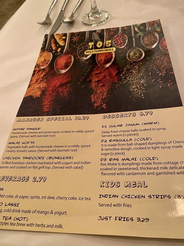 Welcome to TO5 Bollywood Grill, where every dish tells a story of rich Indian heritage. Nestled in Omaha, this charming venue offers a plethora of mouth-watering options perfect for dinner with family or friends. The menu features a delightful selection of Indian breads, including the spicy Bullet Naan and the sweet Kabuli Naan, alongside succulent entrees like the creamy Butter Chicken and aromatic Chicken Tikka Masala.